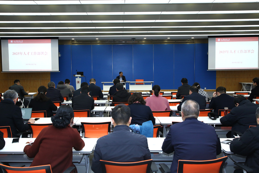 杜增吉在会上讲话,部署年度人才工作。他指出,高校作为科技创新的重要主体,在高层次人才引育方面肩负着国家战略使命。对照高水平大学建设目标,学校在人才引进方面仍有较大提升空间,在学校冲击A类学科、增加博士授权点的关键时期,人才工作的重要性、紧迫性愈发凸显。面对新形势和新任务,杜增吉提出三点要求:一是要实施一把手工程,强化人才工作组织领导,将人才引进和项目申报纳入年度工作重点;二是要构建立体化引才网络,形成协同机制,拓宽引才渠道;三是要提供全流程服务,打造优质的人才发展生态,设立引才“伯乐奖”,激励教职工和校友参与引进高端人才。杜增吉强调,学校将以习近平总书记关于新时代人才工作的新理念新战略为根本遵循,持续推进人才强校战略,为高水平大学建设提供强大的人才支撑。希望各学院及时传达会议精神,组建人才工作领导小组,制定实施方案,确保高质量完成2025年人才工作任务。