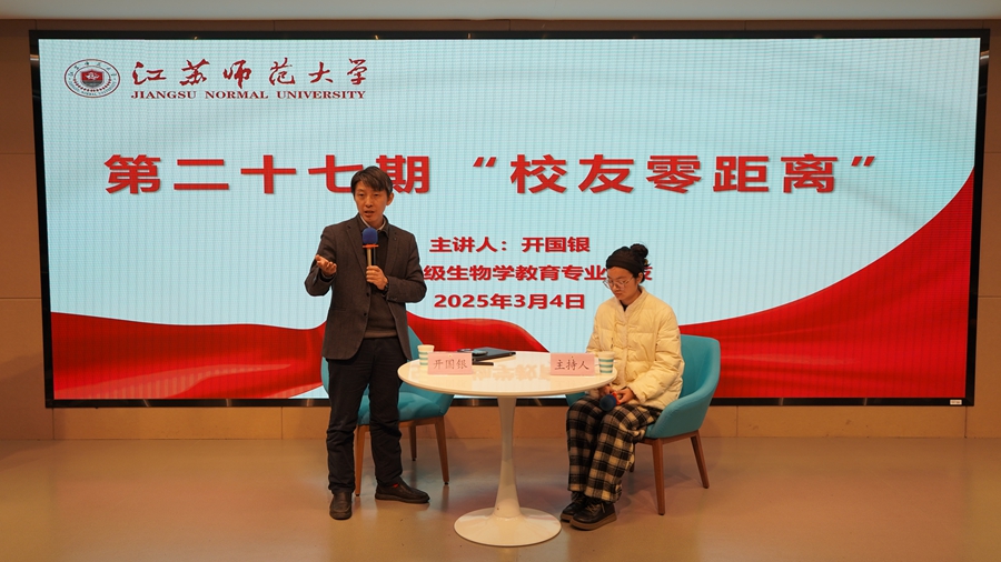 3月4日下午,第二十七期“校友零距离”在泉山校区举行。本期活动特邀国家万人计划领军人才、浙江中医药大学科研部副部长、二级教授、博士生导师、我校浙江校友会副会长、1995级生物学教育专业校友开国银教授重返母校,以“从学生到导师——我的成长之路”为主题,通过沙龙对话形式,为在校学生呈现了一场关于科研成长与育人智慧的深度分享。