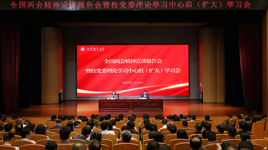 3月26日下午,我校举办学习贯彻全国两会精神宣讲报告会暨校党委理论学习中心组(扩大)学习会。会议邀请全国人大代表、徐州市云龙区委书记陈婕作全国两会精神宣讲报告,传达学习习近平总书记在全国两会期间的重要讲话精神和全国两会精神;邀请江苏省人民政府原参事、南通大学原党委书记成长春作专题报告,解读《教育强国建设规划纲要(2024-2035年)》。在校全体校领导、中层干部、校院两级党委理论学习中心组全体成员,全体思政课教师,全体辅导员和学生代表聆听了报告。