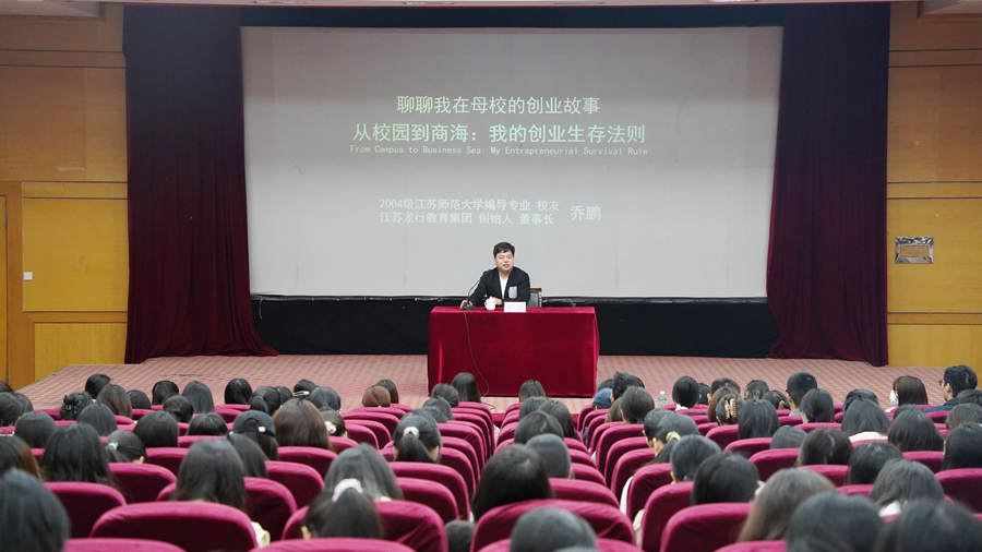 4月26日上午,2025年第六期“校友零距离”在泉山校区敬文报告厅举行。我校2004级广播电视编导专业校友、江苏龙行教育集团董事长乔鹏受邀重返母校,以“从校园到商海:我的创业生存法则”为主题,与同学们进行交流互动。