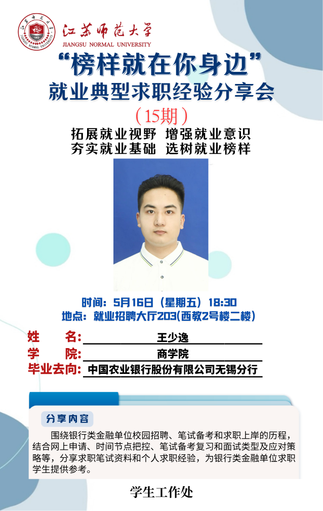 为增强学生就业意识,拓宽就业视野,夯实就业基础,学生工作处结合学生关注度高、求职意愿强烈的行业领域,开展“榜样就在你身边”2025届毕业生就业典型求职经验分享系列活动,充分发挥朋辈榜样的示范引领作用,帮助更多的学生提升就业竞争力。经学院推荐、学校遴选,现将第十五期活动开展相关情况通知如下: