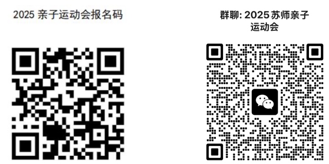 五、报名方式:请参加活动的教职工微信扫码报名,同时扫码入“2025苏师亲子运动会”微信群,分组等相关信息将在群中发布。报名系统于5月19日(周一)下午15:00截止,逾期自动关闭,无法补报。