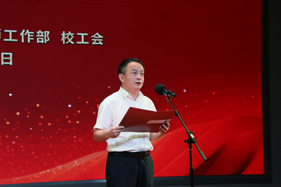 校党委书记芮国强在表彰大会上讲话,代表校党委向辛勤耕耘在教学、科研、管理、服务一线的全体教职员工和离退休教师致以节日的问候和崇高的敬意,向新入职的教师表示热烈的欢迎,向受到表彰的先进集体和优秀个人表示衷心的祝贺。芮国强指出,过去的一年,全体教职员工深入学习贯彻习近平总书记关于教育的重要论述,深入推进“一融双高”,聚力推进“改革、拓展、转型、提档”,各项事业取得显著成效。站在新的起点,我们要体悟教育家精神,铸牢强师之魂。要践行教育家精神,扛起强国之责。要弘扬教育家精神,贡献发展之力。要以教育家精神为引领,以先进典型为榜样,以昂扬的斗志、务实的作风、创新的精神,奋力推进学校高水平大学建设,在教育强国建设的伟大实践中书写师大新华章。