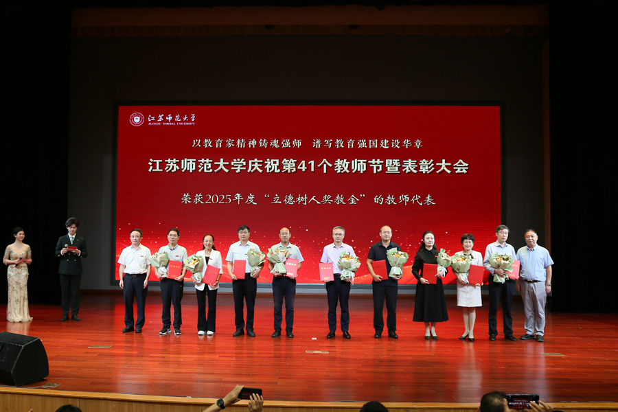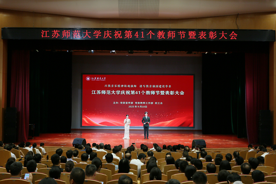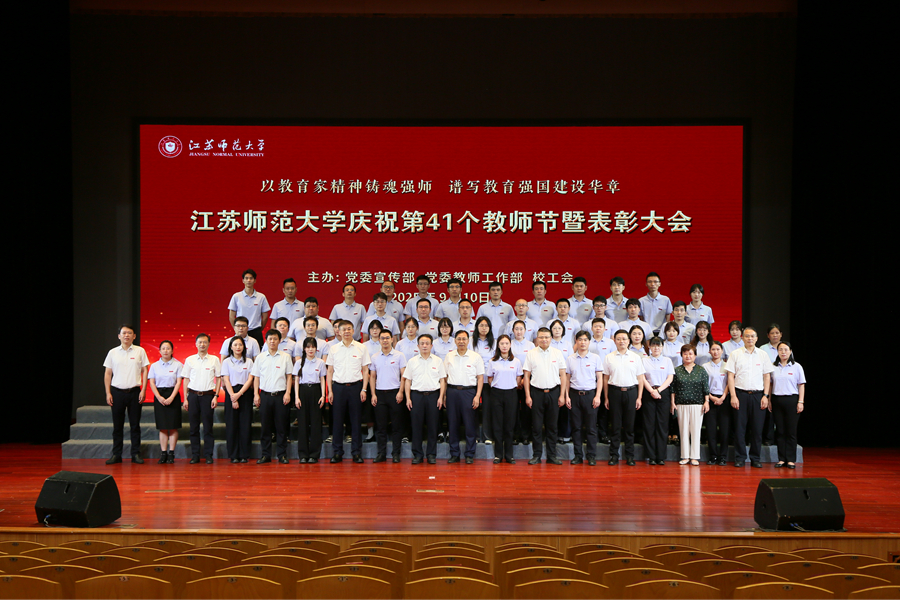 9月10日下午,江苏师范大学举办“以教育家精神铸魂强师,谱写教育强国建设华章”为主题的庆祝第41个教师节暨表彰大会。在校全体校领导、江苏省教育基金会副秘书长张虎成、各学院党政负责人、机关部门和直属单位主要负责人、教师代表、接受表彰的先进集体和个人代表、从事教育教学30周年教师代表、退休教师代表、新入职教师和学生代表参加表彰大会。