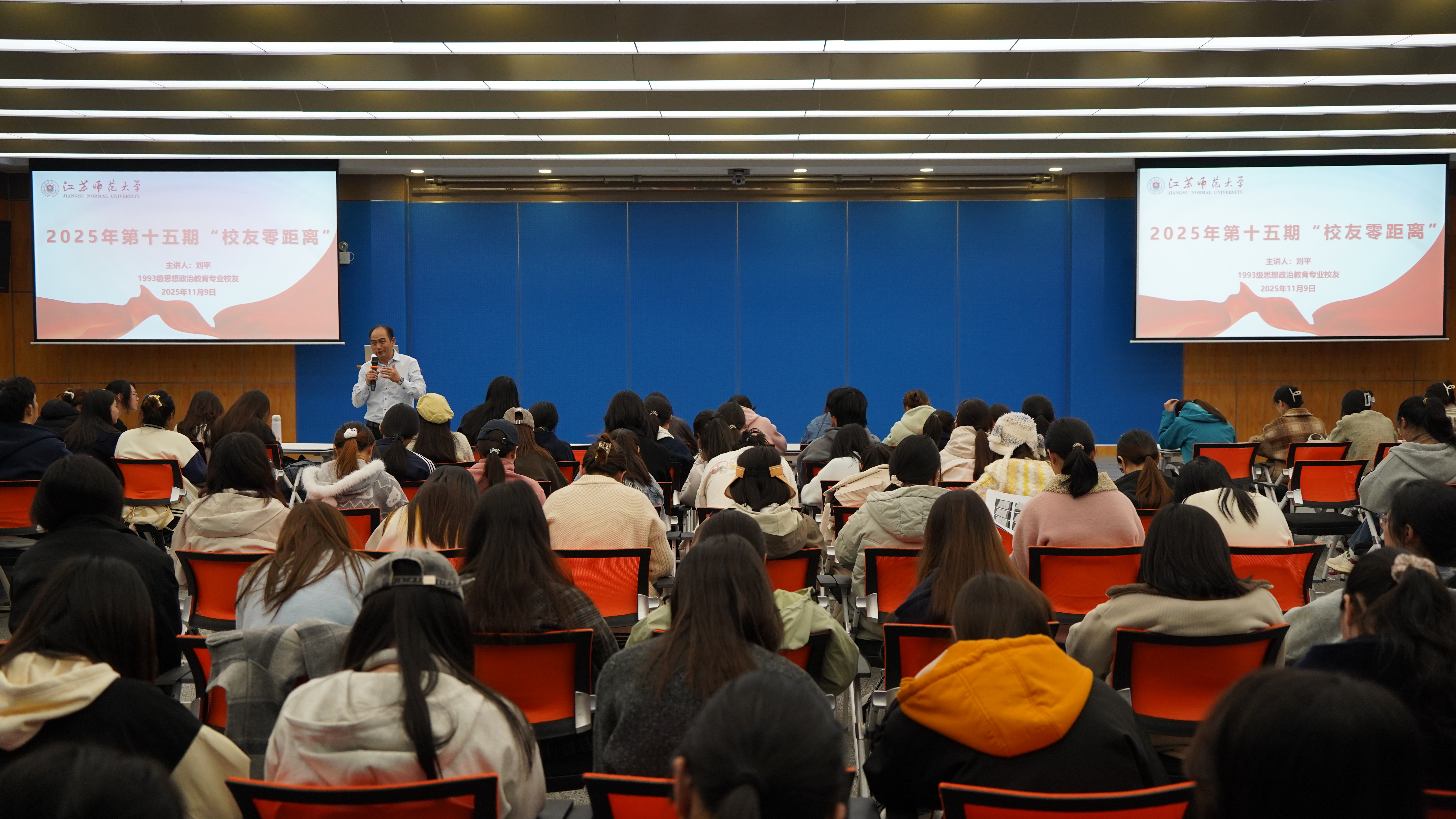 11月9日下午,2025年第十五期“校友零距离”在分析测试中心300会议室举行。我校1993级思想政治教育专业校友、全国优秀班主任、江苏省教学名师刘平以“在平凡中耕耘意义:一位一线教师的生活叙事”为题,与150余名学生展开一场深度而温暖的对话。