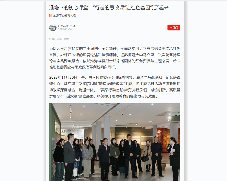 为深入学习贯彻党的二十届四中全会精神,全面落实习近平总书记关于传承红色基因、办好思政课的重要论述和指示精神,江苏师范大学马克思主义学院坚持理论与实践深度融合,依托淮海战役烈士纪念塔园林的红色资源与主题临展,着力推动基层党建与思政课改革创新同向同行。