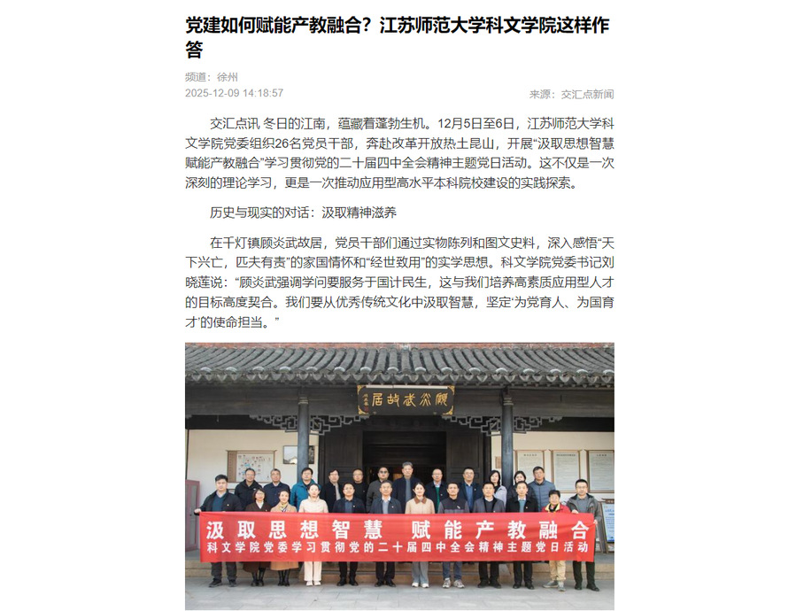交汇点讯 冬日的江南,蕴藏着蓬勃生机。12月5日至6日,江苏师范大学科文学院党委组织26名党员干部,奔赴改革开放热土昆山,开展“汲取思想智慧 赋能产教融合”学习贯彻党的二十届四中全会精神主题党日活动。这不仅是一次深刻的理论学习,更是一次推动应用型高水平本科院校建设的实践探索。