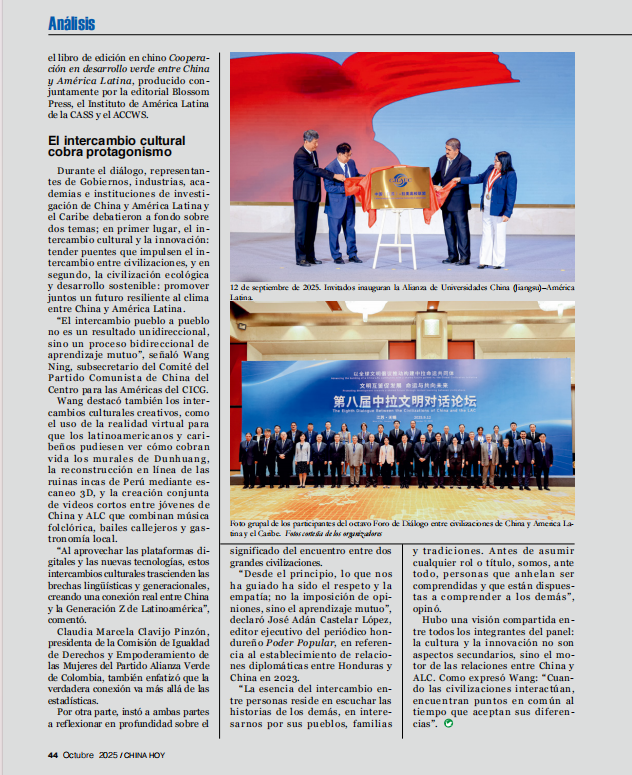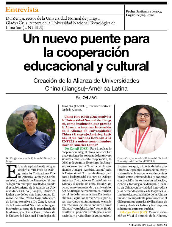 此次报道源于今年9月在江苏无锡举办的第八届中拉文明对话论坛,该论坛由江苏省人民政府外事办公室、中国社会科学院拉丁美洲研究所、中国外文局当代中国与世界研究院联合主办。作为本届论坛的两项重要成果之一,由我校作为会长单位联合22所国内高校和33所拉美高校、科研机构共同发起的“中国(江苏)—拉美高校联盟”正式成立。中国外文局依托《今日中国》杂志的国际传播影响力,以“中国—拉美高校校长对话”形式,邀请我校校长杜增吉教授和拉方创始成员单位——秘鲁南利马国立科技大学校长格拉迪斯·克鲁斯教授共话中拉合作新路径。