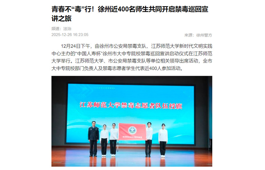交汇点新闻12月26日发布我校与徐州市公安局禁毒支队主办的禁毒巡回宣讲活动,内容如下: