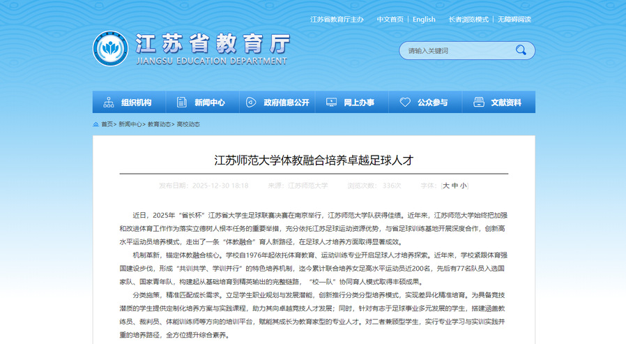 江苏省教育厅官网12月30日发表我校体教融合培养卓越足球人才文章,内容如下: