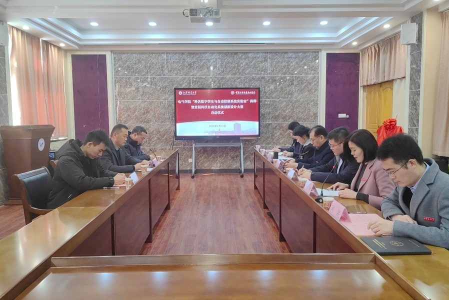 为深化校企协同育人机制,拓展产教融合实践平台,切实提升人才培养质量,1月16日上午,电气学院举办“科沃数字孪生与自动控制系统实验室”揭牌暨首届科沃自动化系统创新设计大赛启动仪式。校长杜增吉出席活动,南京科沃信息技术有限公司总经理苗珍、技术总监管连勇、工程师贾彬彬及电气学院班子成员、师生代表参加活动。
