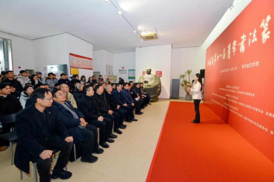 1月20日,由我校与江苏省青年书法家协会、徐州市文学艺术界联合会等单位联合主办的江苏省第十一届青年书法篆刻作品展在徐州李可染艺术馆隆重开幕。团省委副书记、省青联主席张永意出席开幕式并讲话,徐州市委宣传部副部长窦铜顺致辞,我校党委常委、副校长商亮,省政府参事、省书协副主席、省青书协名誉主席刘灿铭,省书协副主席王伟林、金丹,省青年书协主席、我校美术学院教师张磊等嘉宾以及徐州市有关单位负责人、全省青年书法工作者及艺术界代表近100人出席开幕式。我校团委、美术学院负责同志参加了开幕式。