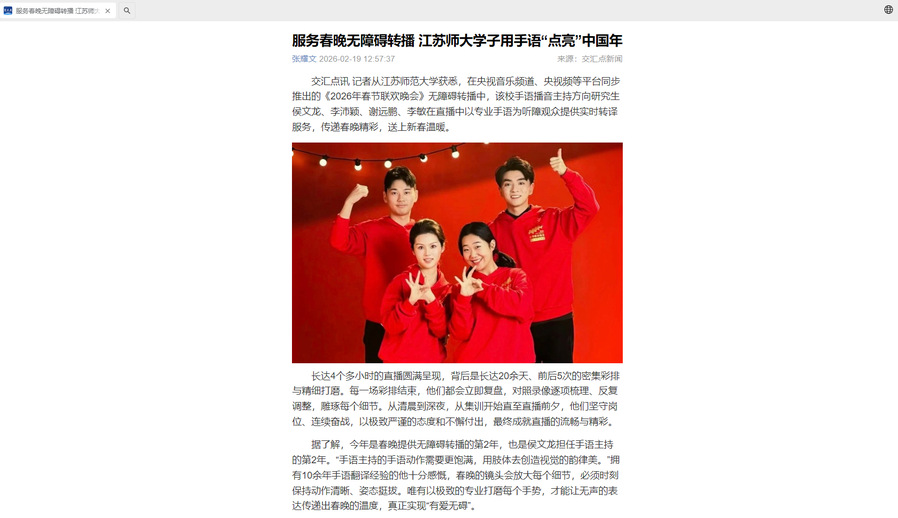 交汇点讯 记者从江苏师范大学获悉,在央视音乐频道、央视频等平台同步推出的《2026年春节联欢晚会》无障碍转播中,该校手语播音主持方向研究生侯文龙、李沛颖、谢远鹏、李敏在直播中以专业手语为听障观众提供实时转译服务,传递春晚精彩,送上新春温暖。