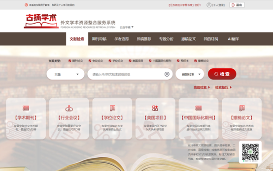 “古扬外文学术资源整合服务系统”是国内首家专业化、规模化一站式外文学术资源发现平台,整合了全球5亿条高价值外文数据资源,涵盖期刊、论文、会议、预印本、科研项目等多种类型,资源最早可回溯至1665年,全面覆盖全学科领域及SCI/EI等权威收录范围,其中超10000种OA期刊的6000万条以上开放资源可直接下载。该系统通过文献深度标引,提供双语检索(支持中文检索,有效打破语言障碍)、智能筛选、投稿分析、撤稿预警、学者追踪、专题分析、信息定制等全流程科研服务,集资源整合、检索查询、数据分析挖掘、文献获取、科研辅助及学术互助社区等多功能于一体,是国内师生快速获取外文前沿成果、提升科研效率的核心工具。