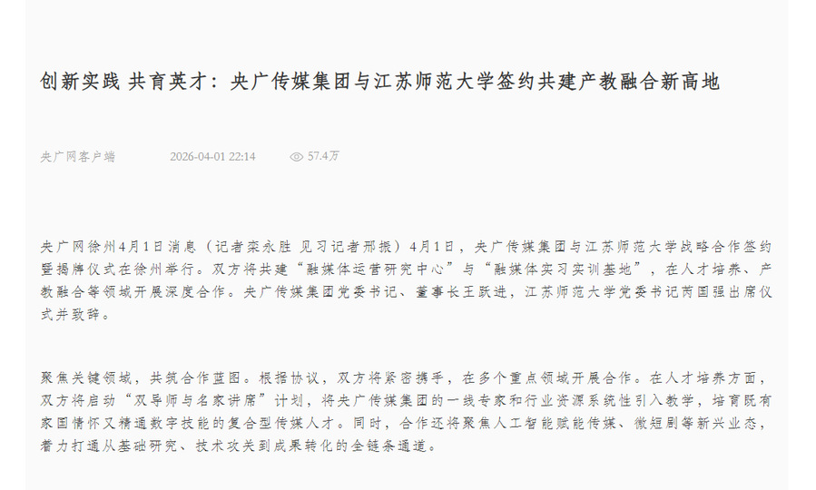 央广网4月1日报道央广传媒集团与江苏师范大学签约共建活动,报道内容如下: