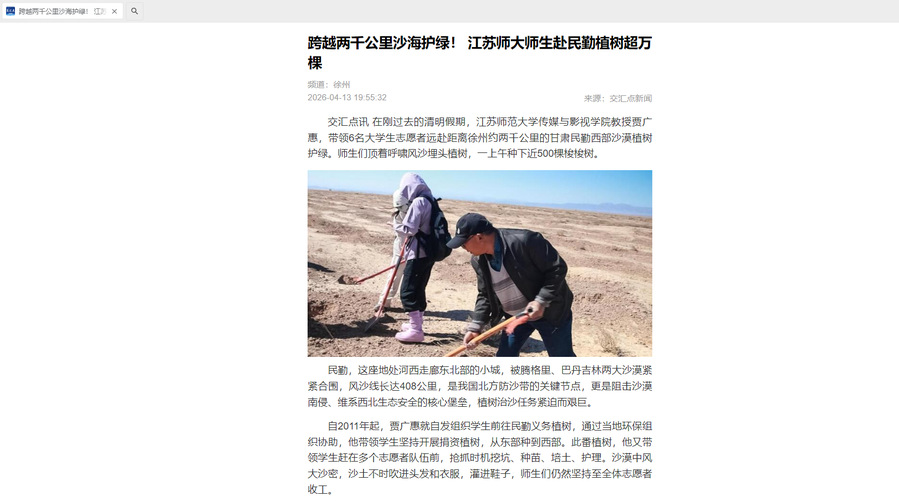 交汇点新闻4月13日关注我校传媒与影视学院师生赴甘肃民勤开展植树护绿活动,内容如下: