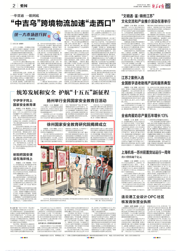 新华日报4月15日报道徐州国家安全教育研究院在我校揭牌成立,内容如下: