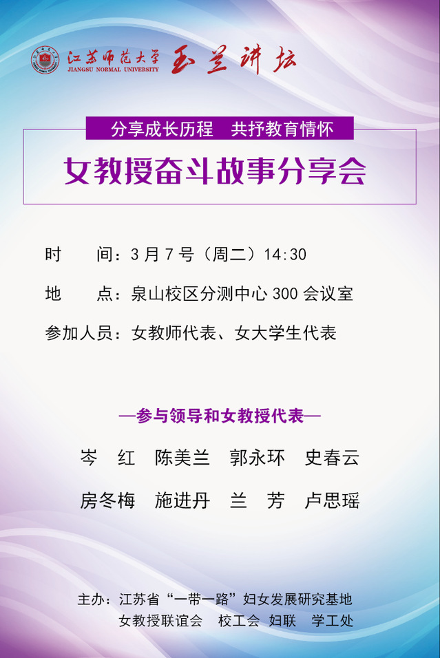 根据庆“三八”国际妇女节系列活动安排,近日举办“玉兰讲坛·分享成长历程 共抒教育情怀——女教授奋斗故事分享会”,欢迎参加!