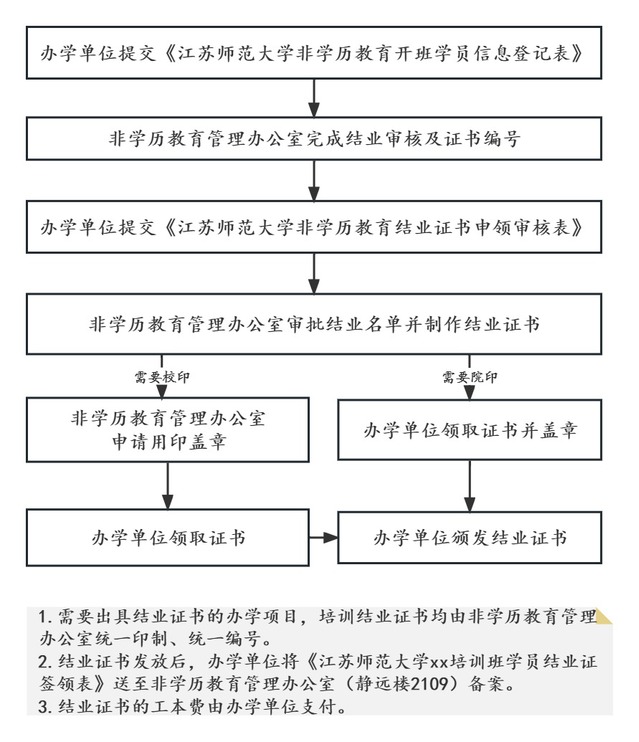 根据《江苏师范大学举办非学历教育管理规定》的要求,为进一步加强学校非学历教育培训结业证书的管理,决定对非学历教育结业证书实行统一印制和发放。证书申领及加盖印章流程如下: