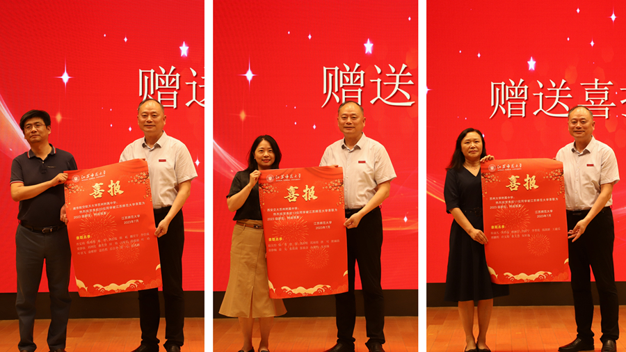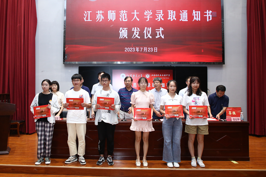 会上,校领导向新生和家长们从学校人才培养、师资队伍、学科建设、科技创新、国际交流等方面介绍了江苏师范大学的基本情况,并向录取的新同学表示热烈欢迎,希望新生们能够充分利用假期,尽快转变角色,提前做好学业规划,坚持学习和锻炼、素养与能力并重,自觉把个人之梦融入国家富强、民族复兴之梦中去。新生代表们纷纷表达了考入江苏师范大学的喜悦之情,同时对辛勤培育他们的中学表达了真诚谢意,展望了对未来大学生活的美好憧憬。与会领导与相关负责同志分别与家长和新生座谈交流。家长及受访中学领导纷纷表示,江苏师范大学校领导不辞辛苦,到各个学校现场颁发录取通知书,体现了对学生的关爱,是一堂生动的“大学第一课”,他们希望同学们进入大学以后,能够坚定理想、不忘初心、接续奋斗,创造属于自己、属于社会、属于国家和民族的无悔青春。
