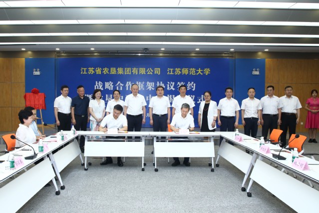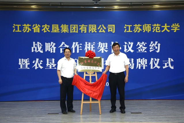 8月10日上午,江苏省农垦集团有限公司与江苏师范大学战略合作框架协议签约暨农垦史研究中心揭牌仪式在我校举行,以实际行动贯彻落实习近平总书记考察江苏重要讲话精神,加强优秀传统文化的保护传承和创新发展,在建设中华民族现代文明上探索新经验。江苏农垦集团党委书记、董事长魏红军,校党委书记方忠出席并致辞,江苏农垦集团党委副书记、总经理胡兆辉与校党委副书记、校长周汝光共同为江苏师范大学农垦史研究中心揭牌,江苏农垦集团党委副书记姚准明与校党委常委、副校长蔡国春共同签署《战略合作框架协议》,江苏师范大学农垦史研究中心主任岑红发言。江苏农垦集团党委委员、总会计师刘克英,党委委员、纪委书记李旭东,副总经理刘耀武,党委委员、副总经理王立新,党委委员、工会主席杨义林,江苏师范大学党委常委、党委宣传部部长孟召学,党委常委、党委统战部部长、党委办公室主任商亮出席。江苏农垦集团总法律顾问、总经理助理、总经济师和总部各部门主要负责同志,江苏师范大学党委教师工作部、人事处兼人才工作办公室主要负责同志,历史文化与旅游学院领导班子成员,农垦史研究中心主要研究人员参加。仪式由江苏师范大学人文社会科学研究院院长娄峥嵘主持。