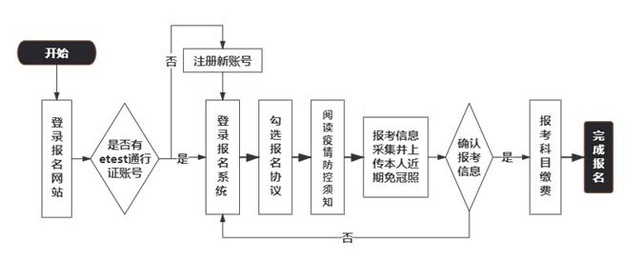 网上报名需要ETEST通行证账号,该账号在教育部考试中心所有使用ETEST通行证的报名系统中通用。若考生已有ETEST通行证,则直接登录报名;若没有该账号,需要先进行账号注册后再进行报名。