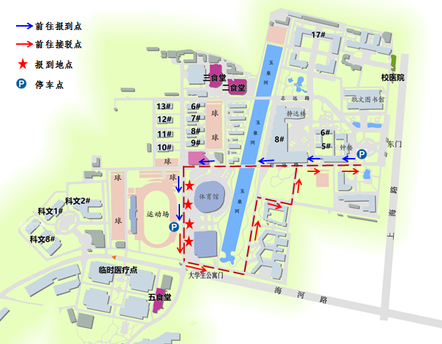 3. 迎新期间校内主干道路禁止停放任何车辆,请参加迎新的教职工尽量乘坐公共交通工具来校,并能尽早来校以防途中交通拥堵。