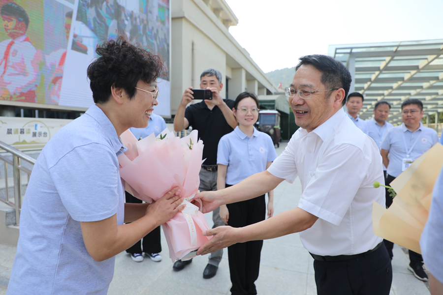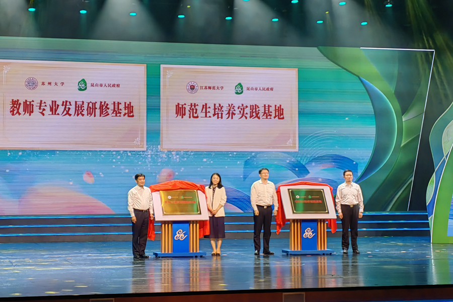 在江苏师范大学附属昆山市实验中学,商亮一行实地考察了校园,并与学校领导班子进行座谈。在教师节庆祝表彰大会上,商亮充分肯定了附属昆山市实验中学在合作办学上所取得的成绩,勉励全体师生各司其职,共赴美好。在昆期间,商亮与昆山市相关领导进行座谈,双方就基础教育合作办学、师范生培养等方面开展深入交流,并受邀出席昆山市委市政府举办的教师节主题活动并为师范生培养实践基地揭牌。