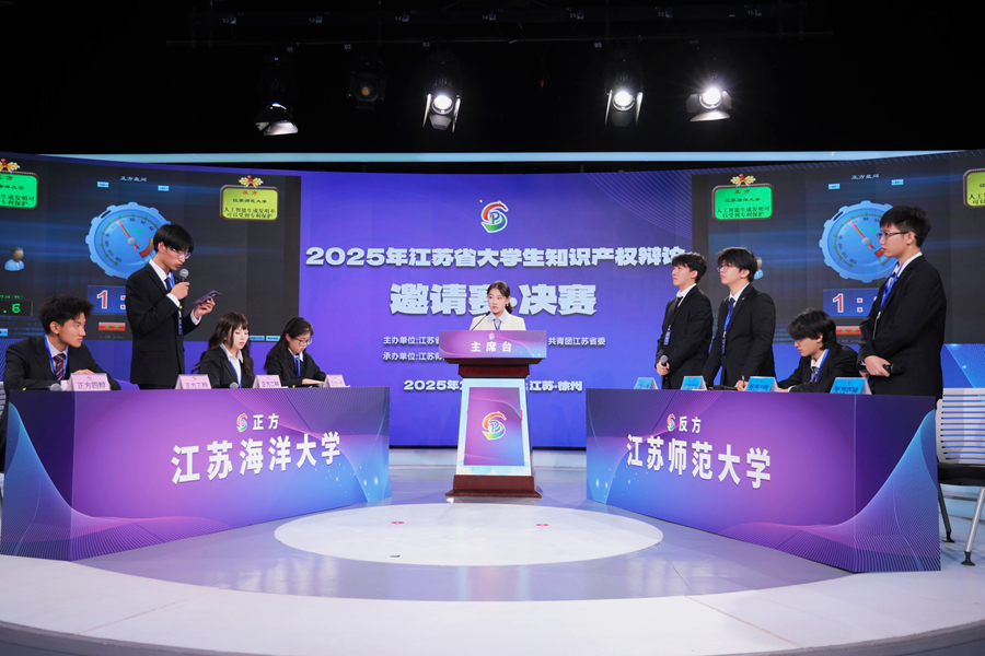 10月25日下午,2025年江苏省大学生知识产权辩论邀请赛决赛在徐州电视台演播大厅成功举办。江苏省知识产权局局长李杰,徐州市人民政府副市长郭晓敏,我校党委常委、纪委书记、省监委派驻监察专员闾浩,江苏省知识产权局副局长张传博出席活动,江苏省教育厅科技处、共青团江苏省委高校部、徐州市市场监督管理局、我校法学院相关同志参加活动。江苏省高级人民法院审判委员会专职委员汤茂仁、华东政法大学知识产权学院院长丛立先、中国市场监管报主任李春、北京己任律师事务所主任何菁、腾讯集团法务部视频维权负责人谭乃文担任决赛评委。 本次赛事自今年6月启动,历时4个多月,吸引了全省24所高校代表队参加。经过层层选拔,南京大学、江苏海洋大学、江苏师范大学、南京农业大学4支队伍晋级决赛。最终,南京大学、南京农业大学、江苏师范大学3支代表队分获冠亚季军,南京农业大学的李思言等同学荣获“最佳辩手”称号,江苏海洋大学的许胜晴等教师获评“优秀指导教师奖”。 江苏省大学生知识产权辩论邀请赛由江苏省知识产权局、江苏省教育厅、共青团江苏省委主办,江苏师范大学承办,主题为“燃辩青春·知创未来”。该赛事已逐步成为江苏省知识产权人才培养的重要平台和品牌活动,有效促进了区域内高校知识产权教育资源的共建共享,推动了知识产权文化在青年学生中的传播与普及,助力江苏知识产权强省建设。 来自江苏省知识产权管理部门、相关高校及新闻媒体代表现场观摩比赛,线上直播观看人次超136万。