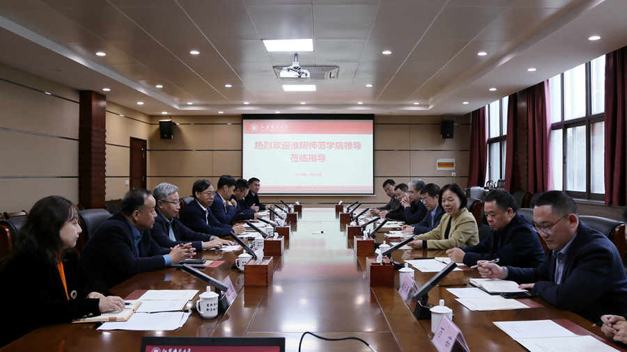 10月29日,淮阴师范学院校长赵祥祥、副校长丁红燕来我校考察,围绕“十五五”规划编制、学科专业优化调整、有组织科研、高层次人才引育机制等议题展开深入交流。我校校长杜增吉、副校长董晓臣出席活动,两校相关职能部门负责同志陪同活动。 杜增吉对赵祥祥一行的到来表示欢迎。杜增吉指出,我校紧紧围绕“十五五”规划编制、学科专业优化调整等重点领域,系统谋划、扎实推进,取得了阶段性成效。希望进一步深化两校在学科建设、科研合作、人才培养等方面的交流互动,共同推进区域经济社会发展和教育强国建设。 赵祥祥对我校的热情接待表示感谢。他说,淮阴师范学院多年来的发展离不开江苏师大的关心帮助。希望充分交流借鉴我校在学科优化、科研组织与人才机制等方面的先进经验,推动两校资源共享、优势互补,共同携手打造高校合作新典范。