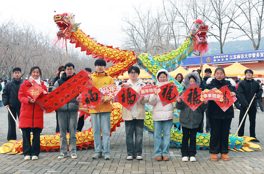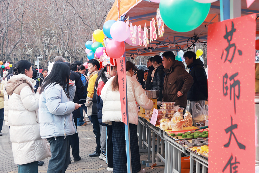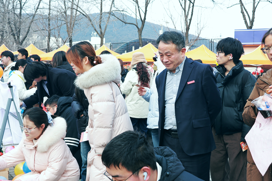 1月1日,由党委学生工作部主办的“苏师大集·万事大吉”元旦欢乐游园会在泉山校区举办。本次游园会紧扣“发展型资助”主题,创新融合文化浸润、精准赋能、心理关怀多个维度,吸引了全校5000余名师生热情参与。 集市现场,精心设置的喜迎新年集市区和资助育人实践区成为人气最旺的打卡地。同学们在校勤工助学发展服务中心志愿者的陪伴下拓印“福”字、裁剪祝福、缝制香囊,亲身体验非遗魅力。投壶、射箭、套圈、钓锦鲤等传统竞技类游戏现场人头攒动,大家分享着“好运连连”的祝福。糖葫芦、年糕、炒货、棉花糖琳琅满目,后勤保障部饮食服务中心各食堂为同学们提供了年味满满的传统美食,大家纷纷驻足品尝,共忆家乡味道。限量抽取的“成长盲盒”是全场瞩目的焦点,盲盒内不仅有苏师文创礼物,还有就业核心竞争力提升活动优先预约卡、年度成长手账、励志书籍和暖心生活关怀券。此外,集市现场还增设了“减压泡泡”与“感恩邮局”两个心理支持空间,同学们纷纷在信纸上写下对2026年的期许。 游园会期间,校党委书记芮国强来到活动现场,与同学们共逛年味大集,为同学们送上新年祝福,一同感受浓浓的节日氛围。