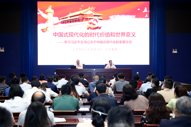 根据学校学习贯彻习近平新时代中国特色社会主义思想主题教育统一安排,5月31日上午,校党委书记方忠在分测中心100会议室以“中国式现代化的时代价值和世界意义——学习习近平总书记关于中国式现代化的重要论述”为题讲授专题党课。省委主题教育第二十五巡回指导组徐寒冰同志到会指导,学校机关党员参加党课学习。 方忠围绕“中国式现代化的鲜明特征、中国式现代化的历史内涵、中国式现代化的世界意义”三个方面内容进行授课。他指出,中国式现代化新道路为中国繁荣进步奠定了重要前提,是对中国社会主义现代化实践经验的最高概括,更是对全人类现代化文明成果的集成性创造和批判性革新。同时,中国式现代化也为发达国家提供了持续发展的现代化方案、为发展中国家提供了独立发展的现代化方案、为不发达国家提供了赶超发展的现代化方案。方忠强调,我们每个人都正在参与中国式现代化建设的伟大事业,学校肩负着人才培养、科学研究、社会服务、文化传承创新、国际交流合作的重要使命,也作出了积极贡献,我们坚信中国式现代化一定能够实现。 聆听党课的机关党员同志一致认为,方忠书记的党课主题突出、内容丰富、脉络清晰、阐释透彻,既有政治高度,又有理论深度,对我们深入学习贯彻习近平新时代中国特色社会主义思想和党的二十大精神具有很强的指导意义。大家表示将在深入推进主题教育中接受思想淬炼和精神洗礼,坚持学思用贯通、知信行统一,在各自岗位上创先争优、苦干实干,为高水平大学建设贡献力量。