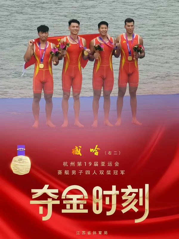 在赛艇项目中,我校有两名毕业生参加比赛,分别是2023届毕业生蔡鹏鹏和臧哈。在赛艇男子八人单桨有舵手决赛中,蔡鹏鹏与队友团结协作,以5分40秒的成绩夺得金牌,这是江苏健儿参加杭州亚运会获得的首枚金牌。同时,蔡鹏鹏在赛艇男子四人单桨决赛中夺得银牌。在赛艇项目男子四人双桨决赛中,臧哈搭档队友以6分02秒问鼎金牌。