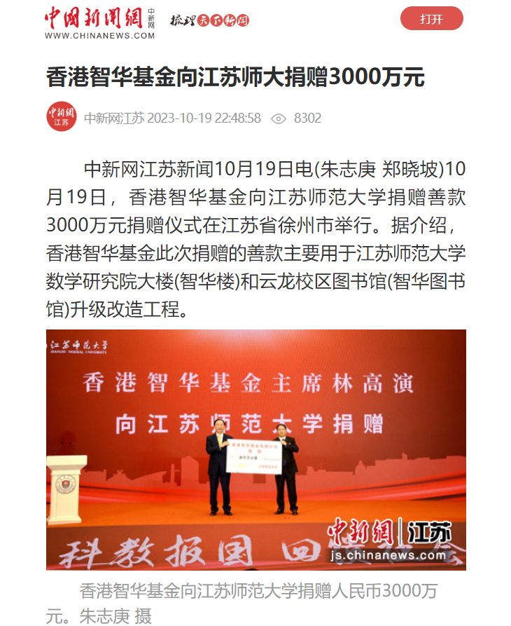 中新网江苏新闻10月19日电(朱志庚 郑晓坡)10月19日,香港智华基金向江苏师范大学捐赠善款3000万元捐赠仪式在江苏省徐州市举行。据介绍,香港智华基金此次捐赠的善款主要用于江苏师范大学数学研究院大楼(智华楼)和云龙校区图书馆(智华图书馆)升级改造工程。