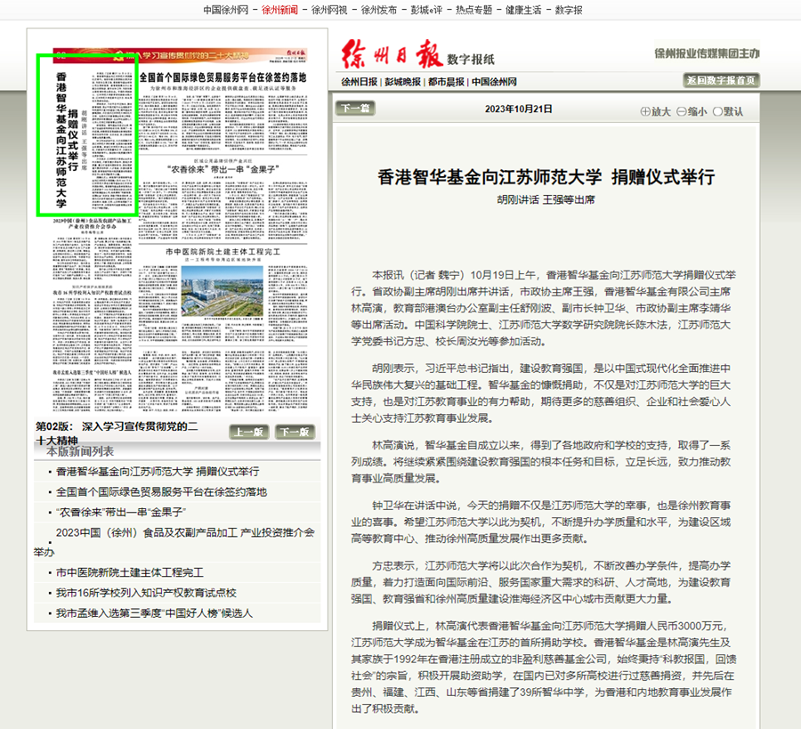徐州日报10月21日报道香港智华基金向我校捐赠仪式,报道内容如下: