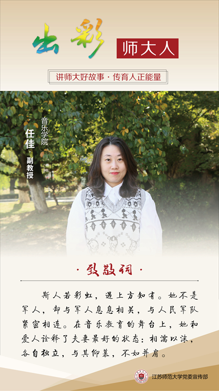 2018年9月,任佳带着女儿离开东北,来到江苏师范大学音乐学院任教。在音乐学院,任佳主要承担本科生、硕士研究生相关课程的教学任务。在任佳的学生们看来,任老师是一个很“飒”、很负责又有些与众不同的老师。