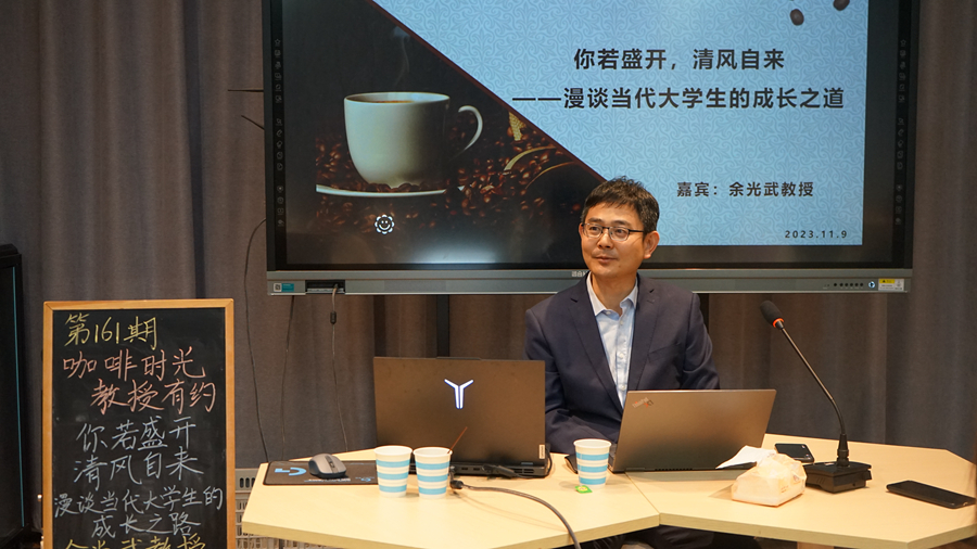 11月9日下午,第161期“咖啡时光·教授有约”活动在“六点汇”实践基地举行。余光武教授就“你若盛开,清风自来——漫谈当代大学生的成长之道”这一主题与在场同学进行了分享交流。