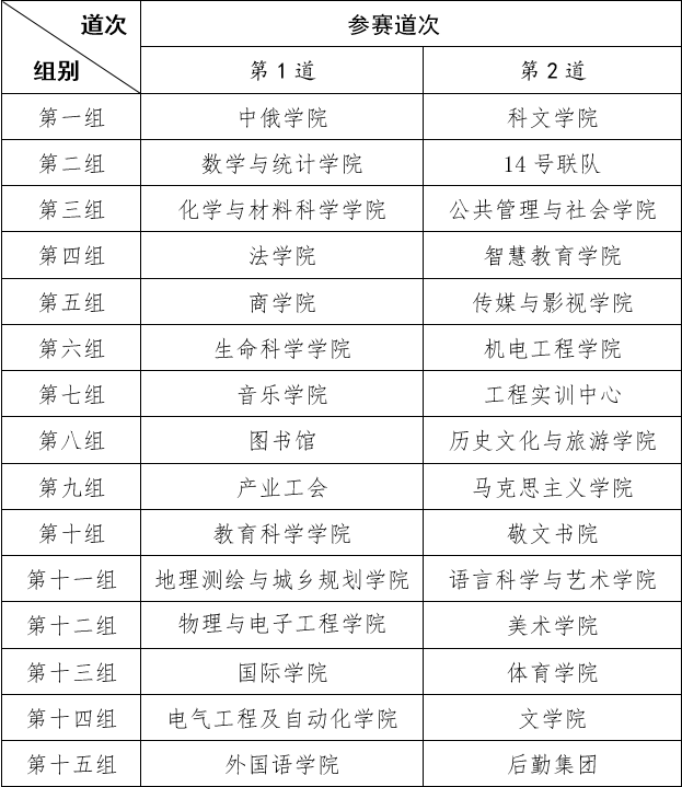 各相关单位: 校第十二届消防运动会开幕式于11月22日(周三)下午2:30在泉山校区教13号楼东侧举行,请各参赛单位于2:20前到场集中,并在指定地点列队。开幕式完毕后,比赛正式开始。现将抽签比赛分组结果予以公布: 保卫处 2023年11月21日