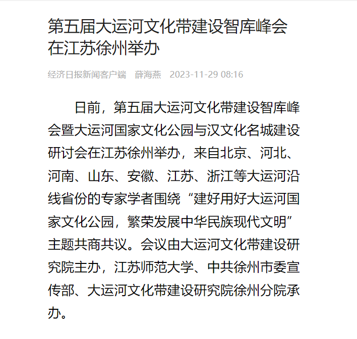 经济日报客户端11月29日报道我校承办的第五届大运河文化带建设智库峰会,报道内容如下: