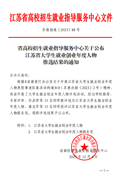 本次评选活动由江苏省教育厅举办,旨在选树推广大学生就业创业典型,发挥就业创业典型的示范引领作用,引导大学生树立正确的成才观、职业观和就业观。活动共评选出基层就业大学生、大学生创业人物、军营大学生士兵三个类型的江苏省大学生就业创业年度人物15名、提名奖15名。
