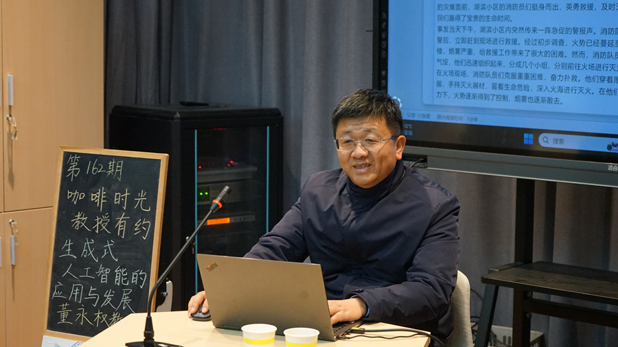 12月6日,第162期“咖啡时光·教授有约”活动在泉山校区“六点汇”实践基地举行。智慧教育学院院长董永权教授就“生成式人工智能的应用与发展”这一主题与在场同学进行交流。