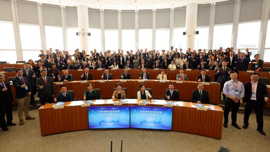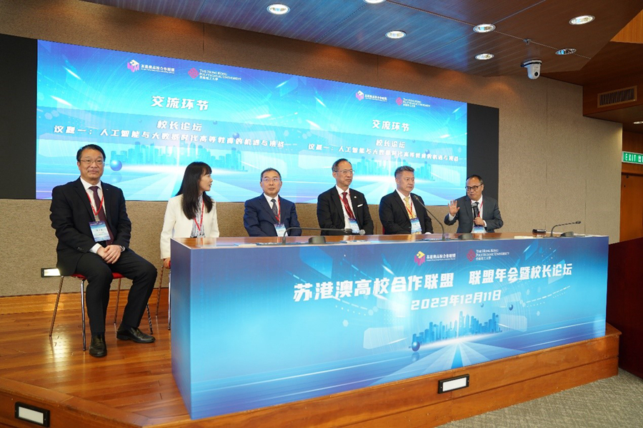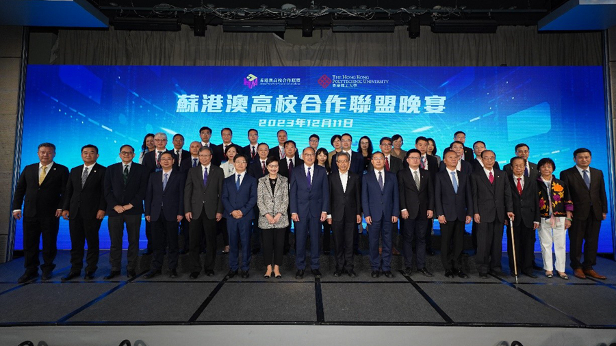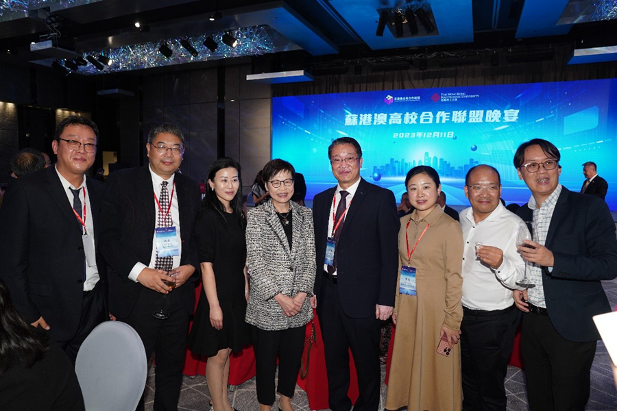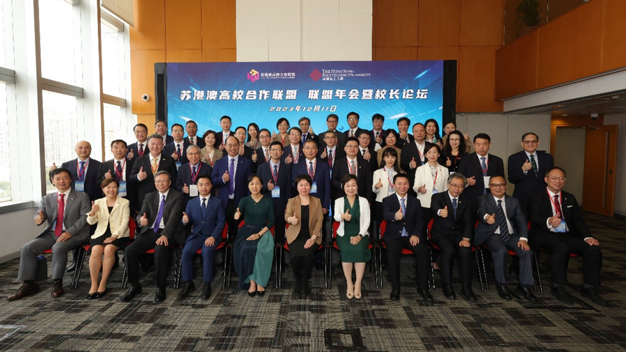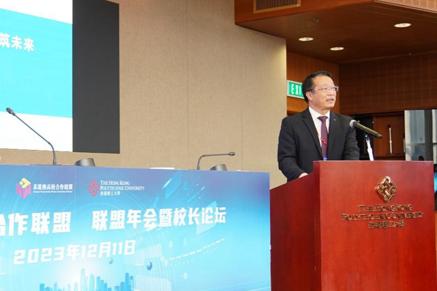 12月11日,代表团首先来到香港理工大学,应邀出席了“苏港澳高校合作联盟年会暨校长论坛”,来自南京大学、东南大学、香港理工大学、香港中文大学、澳门大学、南京师范大学、江苏师范大学等38所成员高校的校领导及专家130人齐聚于香港理工大学,总结联盟工作成绩、共谋联盟发展大计,深入探索苏港澳高校的人才培育及创新科技研究等合作蓝图。国家教育部港澳台事务办公室主任、国际合作与交流司司长刘锦,香港特别行政区政府教育局局长蔡若莲,中央人民政府驻香港特别行政区联络办公室教育科技部副部长吴程,中央人民政府驻澳门特别行政区联络办公室教育与青年工作部副部长李勇先,澳门特别行政区政府教育及青年发展局副局长丁少雄,以及香港特别行政区政府大学教育资助委员会秘书长邓特抗等参加活动。