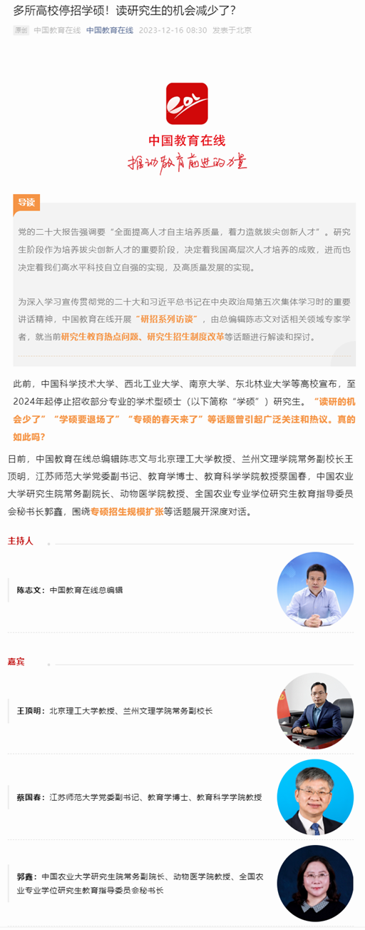 2023年12月16日中国教育在线以“多所高校停招学硕!读研究生的机会减少了?”为题,综合采访我校党委副书记蔡国春等知名教育专家,谈研究生招生政策。报道内容如下: