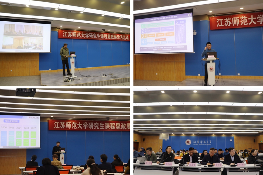 研究生院负责同志作活动总结,希望进行展示的学科切实起好示范引领作用。一是要引导本学科内课程、任课教师高水平开展课程思政建设;二是要推广建设成果,指导学院学科和研究生课程开展课程思政建设,总结建设经验,形成项目总结报告;三是要争优创先,巩固建设效果。研究生课程思政展示月活动将持续开展,期待更多其他示范学科和示范课程进行现场展示。研究生院将通过“江苏师范大学研究生院”微信公众号、研究生在线教学平台“课程思政”栏目同步展出示范学科和示范课程建设成果。
