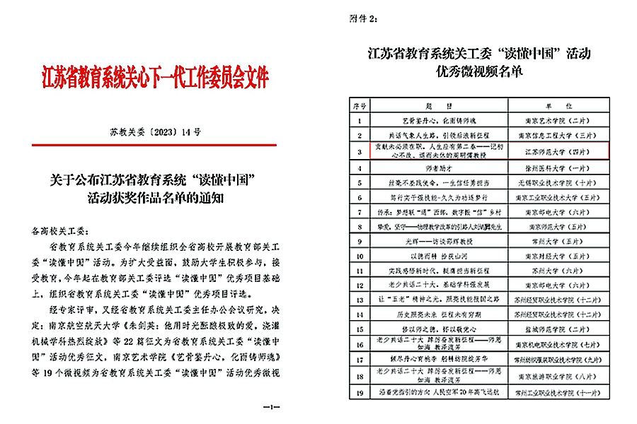 近日,江苏省教育系统关工委发布《关于公布江苏省教育系统“读懂中国”活动获奖作品名单的通知》(苏教关委〔2023〕14号),我校关工委报送的我校原校长周明儒教授事迹《贡献未必须在职,人生应有第二春——记初心不改、退而未休的周明儒教授》纪录片荣获“优秀微视频”奖。