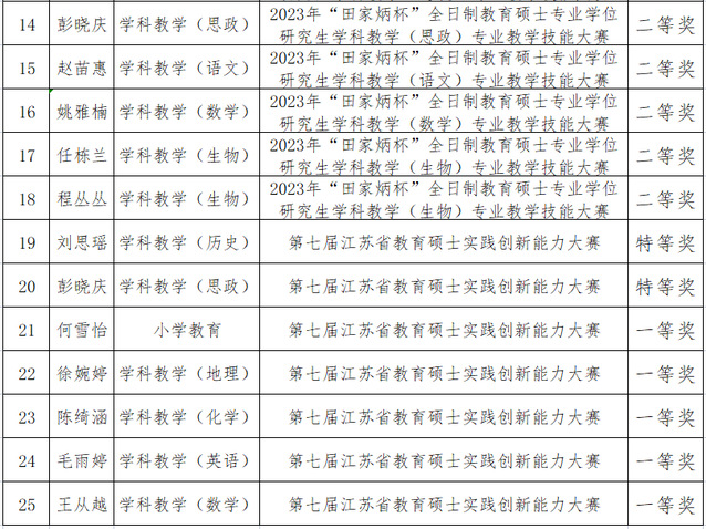 2023年,我校教育硕士研究生参加全国“田家炳杯”教育硕士研究生教学技能大赛和江苏省教育硕士实践创新能力大赛等重要赛事,取得丰硕成果。其中,全国“田家炳杯”教育硕士研究生教学技能大赛获得一等奖8项,二等奖10项;江苏省教育硕士实践创新能力大赛获得特等奖2项,一等奖5项,比赛结果创历史最好成绩。