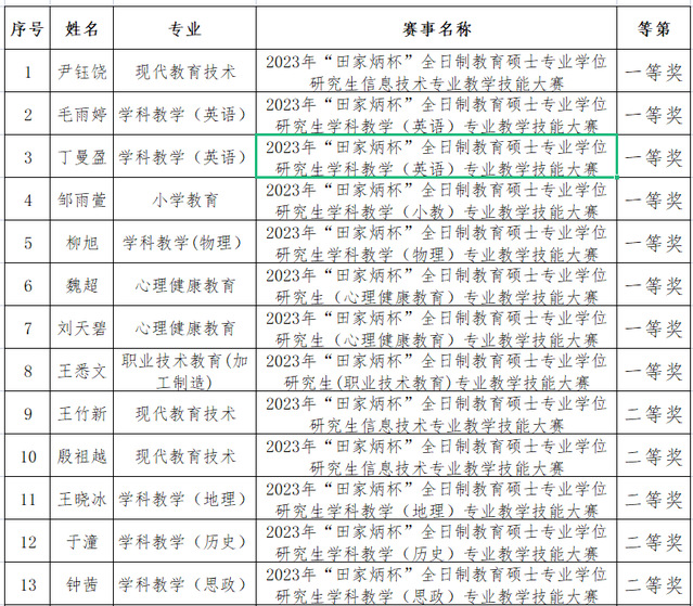 教育硕士研究生在全国全省举办的教学技能大赛中频获佳绩充分展示了我校专业学位研究生教育良好的教学能力、综合素质、专业技能水平和学校人才培养的质量与成果。学校将进一步改革教育硕士研究生培养模式,不断提升教育硕士培养质量,从而培养造就一批高尚师德、扎实教学技能、勇于创新教学、善于综合育人和具有终身学习发展能力的高素质优秀教师后备力量。