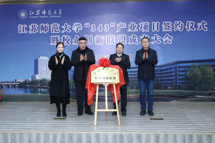 签约仪式结束后,校党委副书记、校长周汝光,校国家大学科技园管理委员会主任廉澄以及江苏极易新材料有限公司、江苏利泷半导体科技有限公司等两位企业的代表共同为“江苏师范大学校企创新联盟”揭牌。江苏师范大学校企创新联盟旨在为进一步落实徐州市“343”创新产业集群发展战略部署,充分发挥江苏师范大学创新资源优势,促进合作企业高质量发展,共同推进科技创新和成果转化。