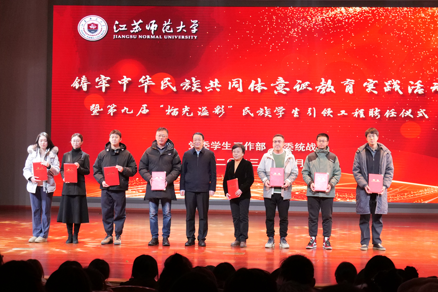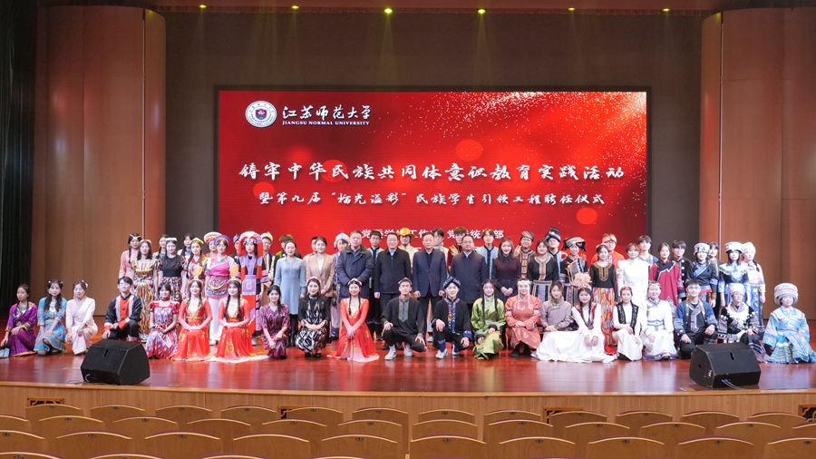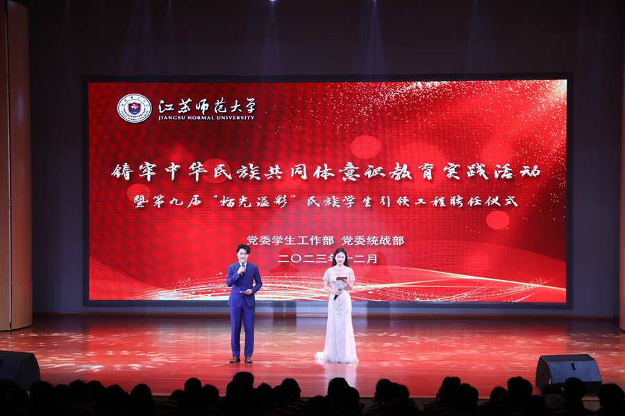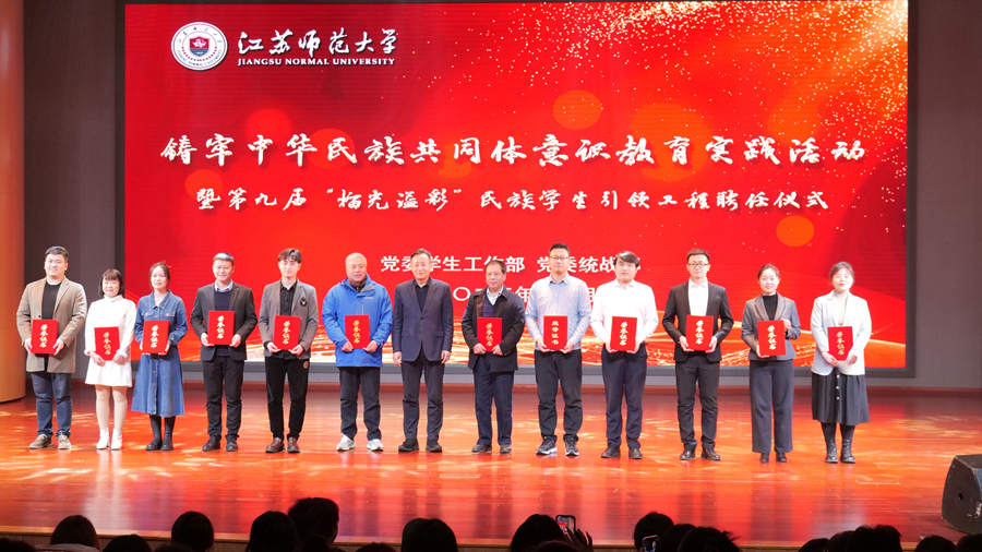12月29日晚,江苏师范大学铸牢中华民族共同体意识教育实践活动暨第九届“榴光溢彩”民族学生引领工程聘任仪式在泉山校区马可音乐厅举行。校党委常委、副校长张玉勤出席本次活动并讲话,党委宣传部、党委统战部、党委学生工作部、保卫处、团委等相关职能部门负责同志参加活动。
