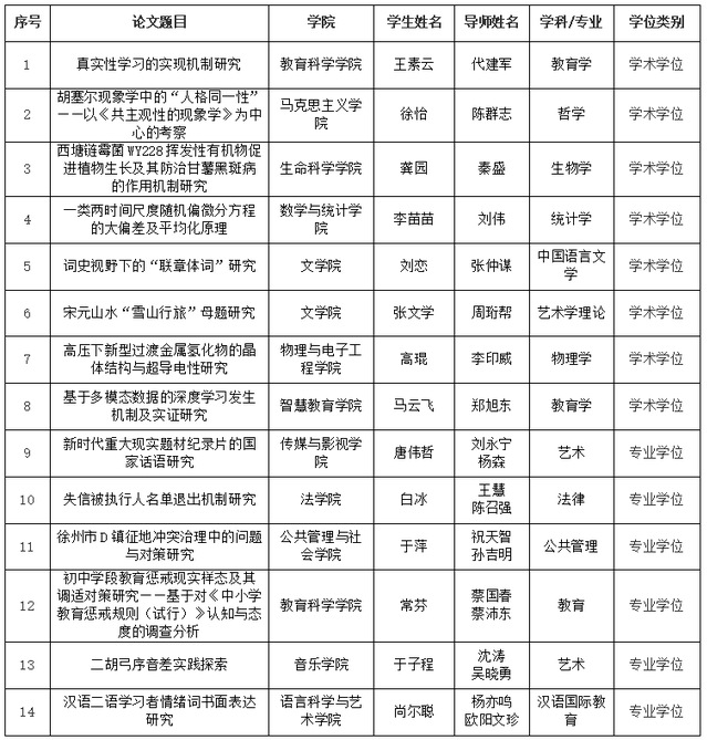 2023年12月29日,省学位委员会、省教育厅发布了《关于公布2023年江苏省优秀博士硕士学位论文评选结果的通知》(苏学位字函〔2023〕6号)。我校共获评14篇优秀硕士学位论文,其中优秀学术硕士学位论文8篇,优秀专业硕士学位论文6篇,获评的优秀专业硕士学位论文创我校新高。 现特向获奖的同学们表示最热烈的祝贺,向辛勤耕耘的导师们表示最真挚的感谢! 研究生院2024年1月8日